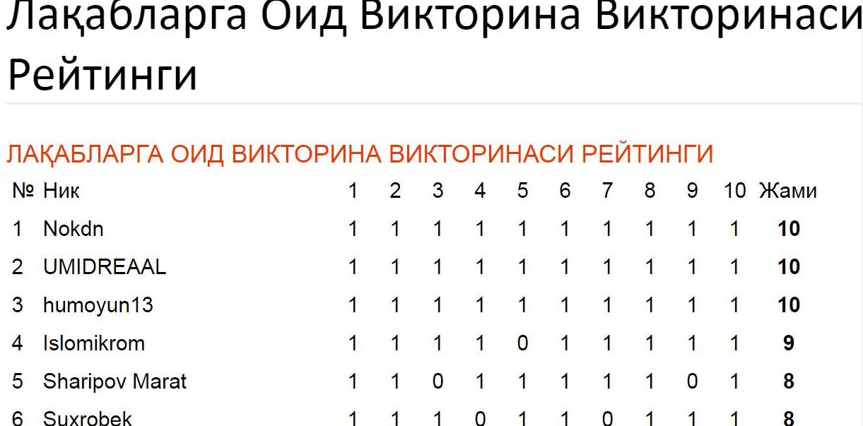 “Viktorina”ning ilk tur g'oliblari aniqlandi. Loyihamizning har bir turida kuchli beshlik aniqlab olinadi va pul mukofoti bilan taqdirlanadi. Bu turda 5 va 6 o'rindagi ishtirokchilarimizning to'plagan ballari bir hil bo'lib qolganligi uchun 6-o'ringa ham pul mukofoti ajratishga qaror qildik.