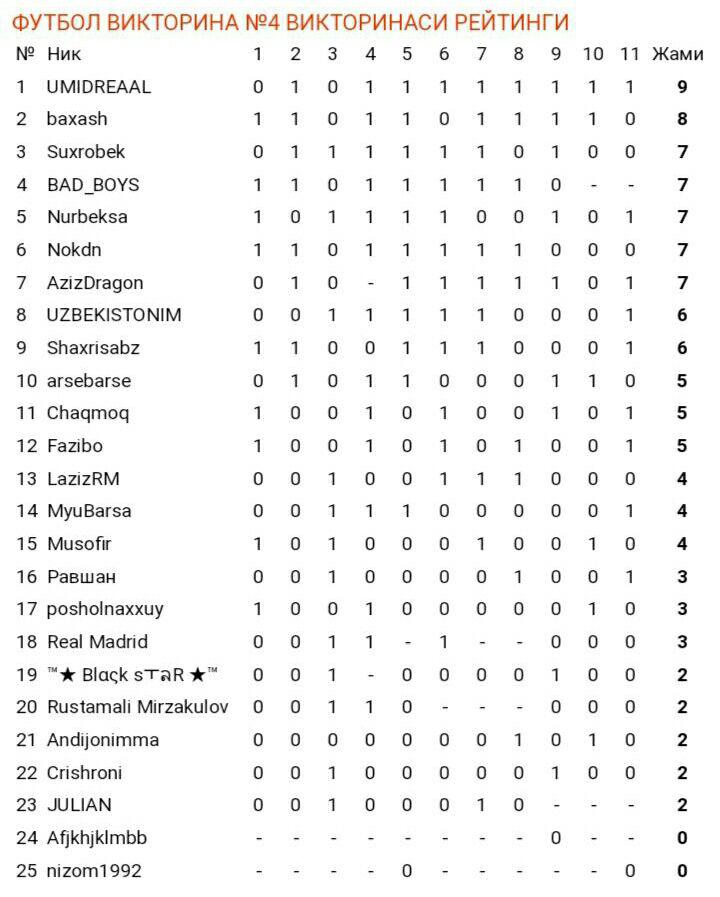 Hozirgina yakunlangan viktorinamiz g'oliblari aniqlandi. Unga ko'ra 1-o'rinni egallagan ishtirokchimiz 20 000 so'm 2-o'rinni egallagan ishtirokchi 15 000 3-dan 7-o'ringacha 10 000 so'm pul mukofotiga ega bo'ldilar. G'oliblardan xabar tagida o'z telefon raqamlarini qoldirishlarini so'raymiz