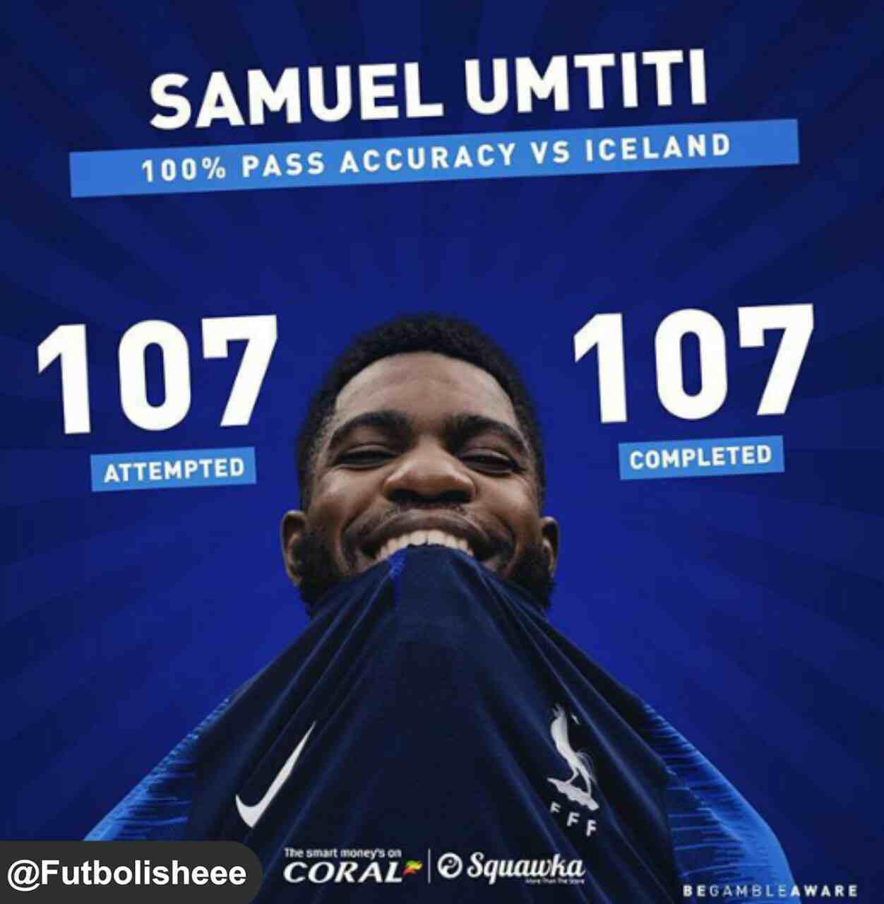 Frantsiya terma jamoasi himoyachisi Samuel Umtitining Islandiyaga qarshi kechgan bahsdagi statistikasi bilan tanishing.